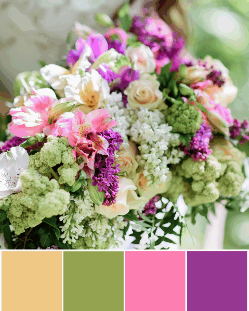 - Amarelo + roxo + rosa claro + verde claro: romântico e delicado.