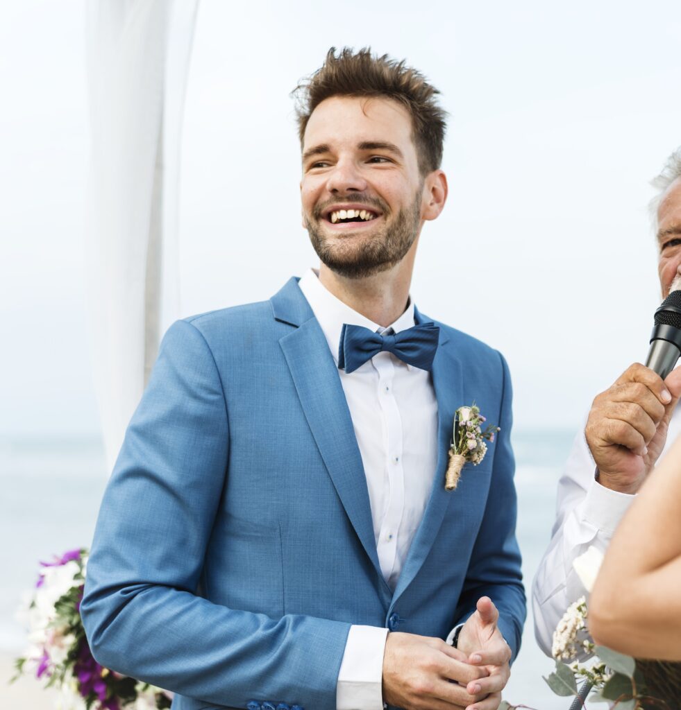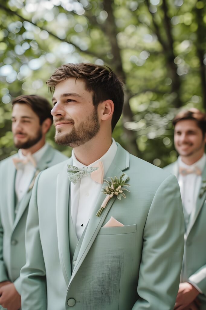 Os trajes masculinos podem explorar cores claras e tons pastéis, como cinza claro, azul-claro, bege e verde-menta. Blazers leves ou conjuntos sem gravata são ideais para cerimônias ao ar livre.