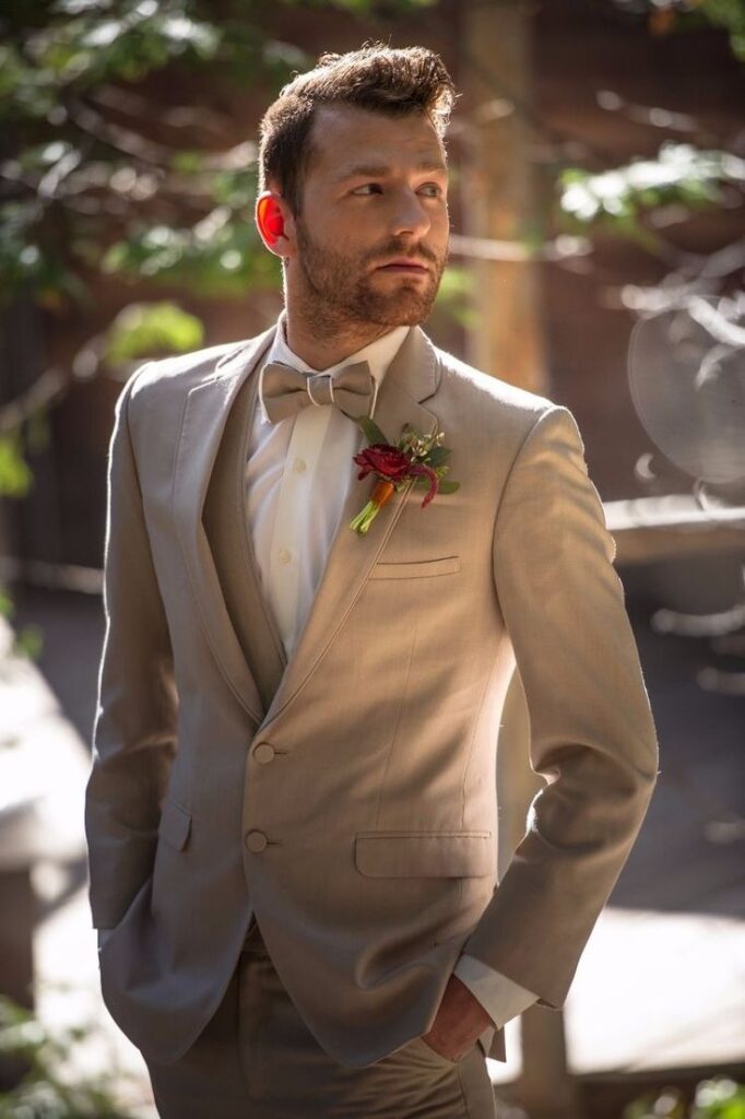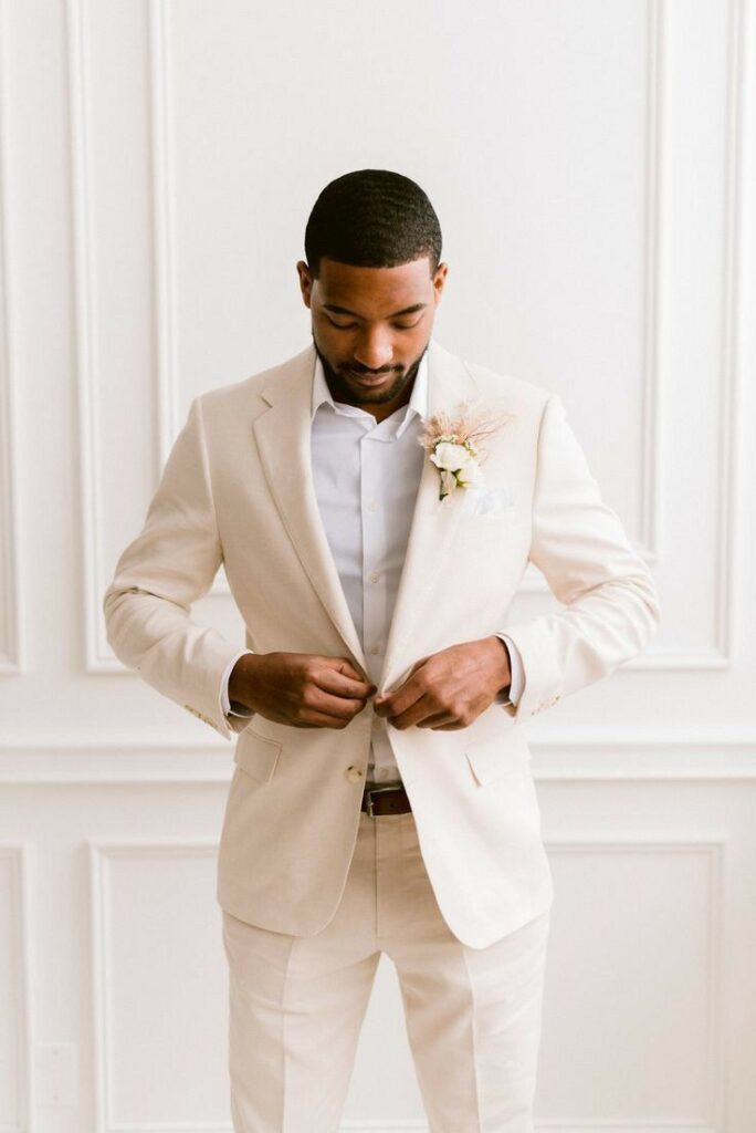 O look do noivo para casamento no verão também deve priorizar tecidos leves e tons claros: