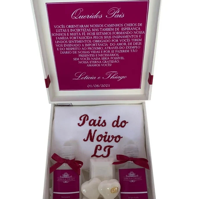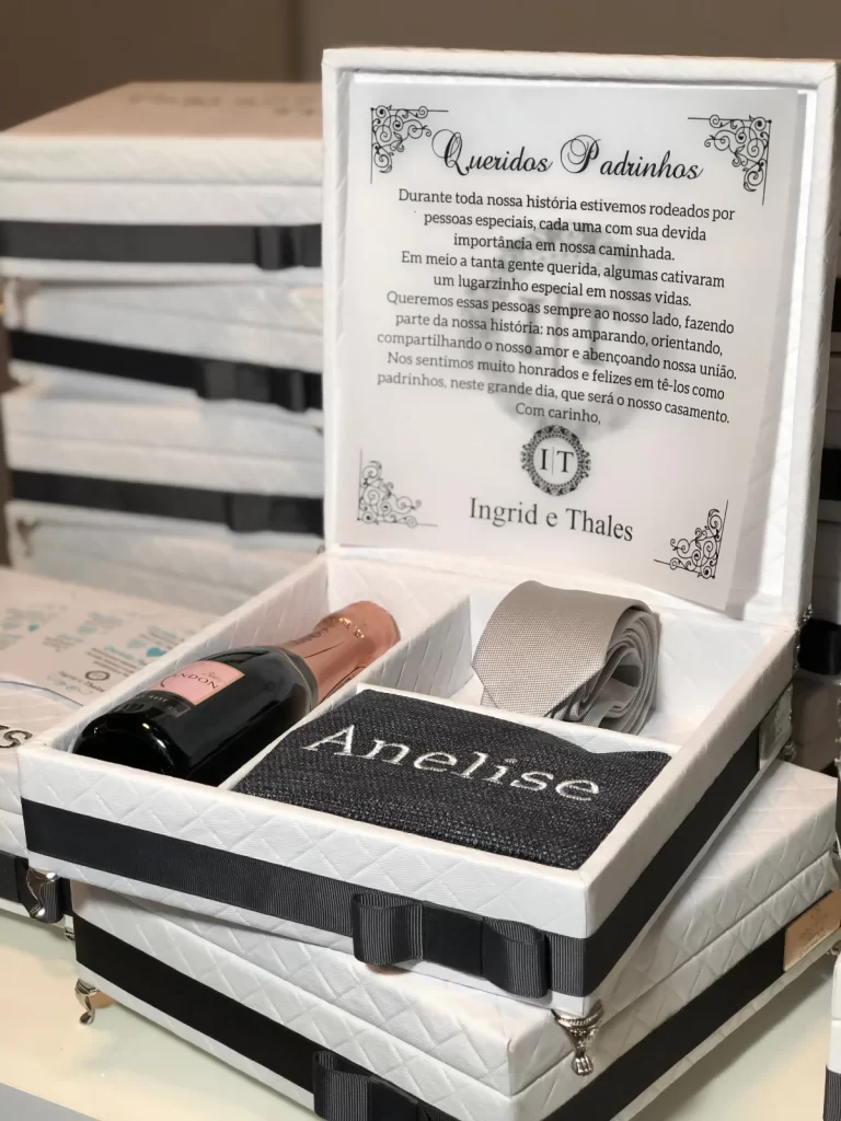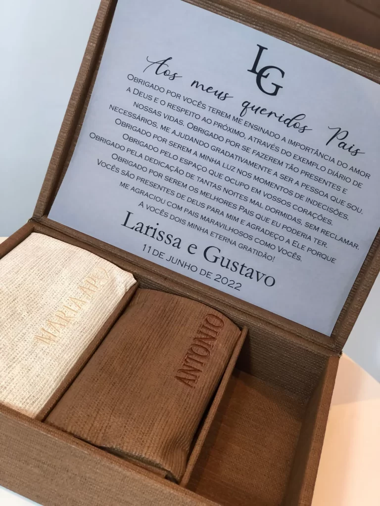 Uma forma carinhosa de agradecer por todo o amor, apoio e presença ao longo do caminho. Versões com fotos, cartas, objetos simbólicos ou a identidade visual do casamento tornam o momento da entrega ainda mais emocionante.